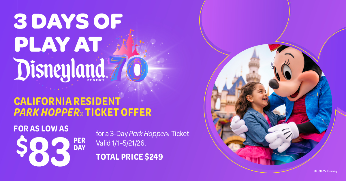 Coming Soon! Save over 50% on a 3-Day Park Hopper Ticket to enjoy both Disneyland Park and Disney California Adventure Park for just $83 per day, $249 total. Visit on 3 days from January 1 through May 21, 2026. Tickets may be used on nonconsecutive days.