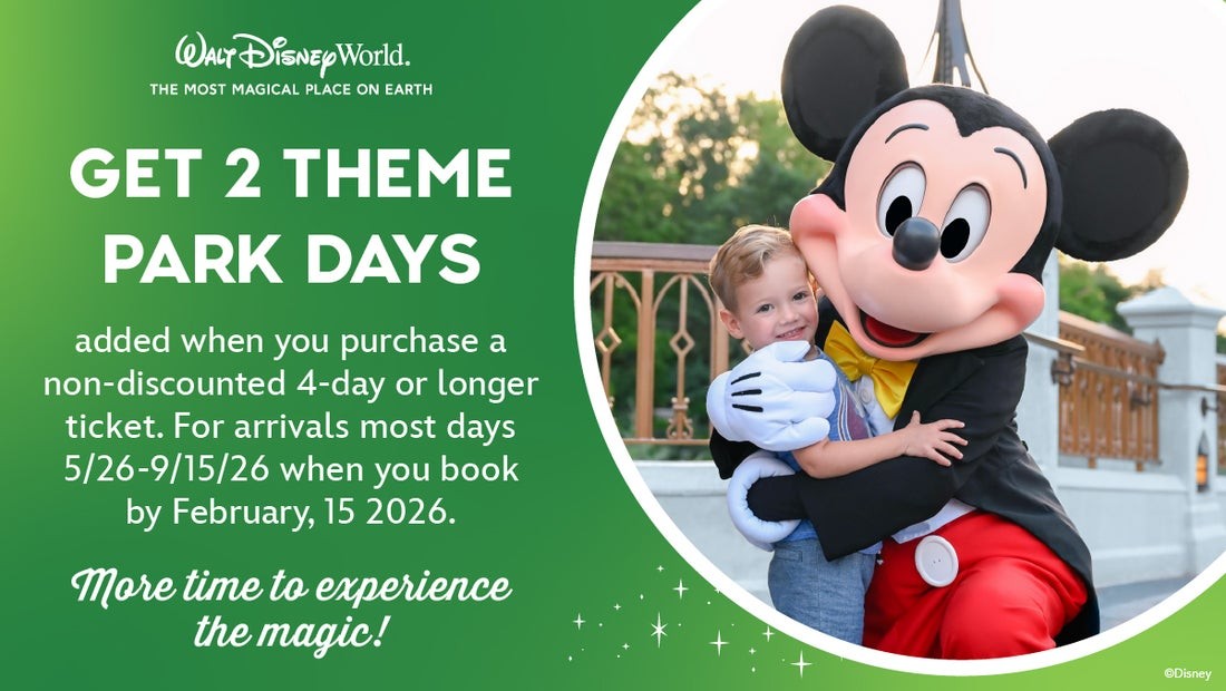 For a limited time, purchase a 4- to 8-Day Disney Theme Park Ticket and receive 2 additional Theme Park days for free.